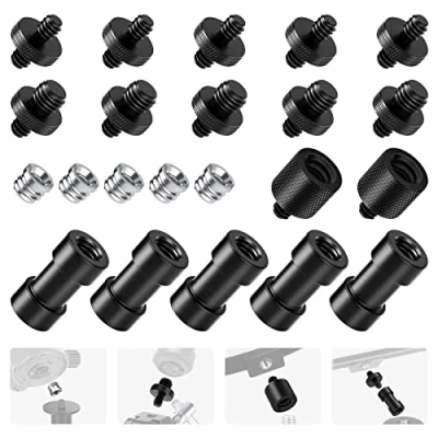 【Broad Compatibility】 This screw adapter kit for cameras and tripods includes a variety of screw adapters to help you combine and use different photography equipment during photo shooting. The kit includes 5 pcs 1/4” male to 1/4” male adapters, 5 pcs 1/4” male to 3/8” male adapters, 5 pcs 3/8” male to 1/4” female adapters, 5 pcs 1/4” female to 3/8” female adapters, and 2 pcs 1/4” male to 3/8” female adapters 【Wide Applications】 The screw adapter kit can combine two photography equipment together. It can be used to connect a wide range of photography accessories such as SLR cameras, tripods, camera cages, mobile phone cages, monopods, ball heads, flash mounts, and shoulder rig camera accessories 【Durable Material】 These screw adapters are made of sturdy aluminum alloy material with precision CNC machining and black anodizing treatment for enhanced durability. Sturdy metal construction helps withstand daily wear and tear. Great for replacing cheap plastic adapters 【Non-Slip Design】 The knurled surfaces on some adapters provide a secure grip and make it easy to install and remove these adapters. Featuring full thread depth without burrs or raised edges, the kit is easy to use and securely attaches to any compatible device 【Easy to Carry】 Lightweight and easy to carry, the kit can be used as a handy backup in your photography equipment. These replacement camera screw adapters are widely used to combine two photography equipment together