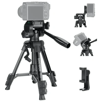 【Introducing NEEWER ENTRY LEVEL VERSION】 Even simpler than BASICS, NEEWER ENTRY LEVEL VERSION is designed with ultimate simplicity and affordability in mind, perfect for absolute beginners who only need the most essential functions without any complexity or extras 【Metal Mini Camera Tripod】 The desktop tripod is a lightweight and portable option, weighing only 1.25 lbs (569 g) and folding down to a compact 12.2 inches (31 cm) for easy transport. Made from metal and plastic, it is designed for convenience, allowing photographers and videographers to effortlessly carry it without adding bulk, making it an ideal support for capturing images both at home and on location 【For Camera & Phone】 The small camera tripod securely supports smaller DSLRs (compatible with Sony Nikon Canon cams), camcorders, webcams, projectors, spotting scopes, action cameras, or phone holders (only the phone holder is included) up to 4.4 lbs (2 kg), compatible with iPhone 16 Pro Max i Phone 15 14 Samsung Galaxy S25 S24 Ultra android, etc., with one cold shoe for filming fill lights or microphones 【3 Way Pan Tilt Head】 The mini tripod features a 3 way pan tilt head with a handle for smooth adjustments, allowing 360° rotation, 90° vertical movement, and 180° tilt for versatile shooting angles, with two built in bubble levels for precise alignment. The 360° rotating feet with nonslip rubber pads ensure a secure grip while adjusting angles, making it easy to capture stunning images confidently 【Easy Height Adjustment】 The table tripod stand is crafted for effortless height adjustments from 11.4" (29 cm) to 24.8" (63 cm) using quick locks and a liftable central axis. For greater precision, the hand crank allows for fine tuning adjustments of up to 4.3" (11 cm). Also comes with a a counterweight hook on the center column for added stability