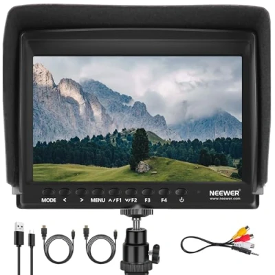 【7 Inch External Field Monitor】 The camera monitor features a 7 inch wide view angle IPS panel in an ultra thin 17mm design with LED backlight. With an HD resolution of 1280 x 800, a brightness of 450 nits, a contrast ratio of 1200:1, and a 16:10 aspect ratio, the monitor ensures exceptional clarity and detail for video recording. Even the volume control allows you to create a quiet recording environment without noises disrupting your workflow 【Supported Formats】The camera screen monitor supports 1080i (60/59.94/50), 1080p (60/59.94/50/30/29.97/25/24/24sF/23.98/23.98sF), 720p (60/59.94/50/30/29/25/24/23.98), 576i, 576p, 480i, and 480p, ensuring compatibility for various video production and playback applications 【Advanced Features】 The field monitor includes monitoring tools such as Peaking Focus Assist, Check Field (Red, Green, Blue, Mono), Pixel to Pixel, Center Marker, Safe Frames (80%, 86%, 90%, 93%, 96%, 2.35:1, off), Image Flip (H, V, V_H), Image Freeze, Monitor Grid, Histogram, and Aerial Mode and Custom Color Temperature for professional use 【360° Ball Head & Sunshade Included】 The mini ball head enables 360° rotation for the video monitor, with a cold shoe mount to attach to DSLR cameras, camcorders, handheld stabilizers, camera cranes, and more. The included sunshade blocks harsh sunlight and makes the display visible outdoors 【Package Contents】 1 x F100 Monitor, 1 x Sunshade, 1 x Mini Ball Head, 1 x HDMI to Mini HDMI Cable, 1 x HDMI to Micro HDMI Cable, 1 x AV Cable, 1 x User Manual