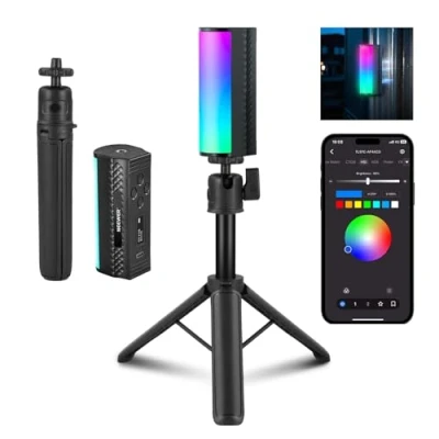 【Pocket Sized Light Wand】 With 36 cool white, 33 warm white, 24 RGB LEDs, this @@@wTJd3V4cXhDLKaiQ1/XWWotfgUGMg/2I@@@ 4.5W tube light equipment delivers vibrant colors with a max illuminance of 360lx/0.5m, a high CRI of 97. Compact at 4.3"x1.6"x1.7"/108x40x44mm, weighing 4.7oz/134g, used alone or with more units for more creative. Ideal lighting accessories for camera gear photography, vlogging, live streaming, parties, weddings, camping, still life photos, studio photoshoots, YouTube/TikTok video recording, filming, etc 【Upgraded with APP Wireless Control】 The "NEEWER" app lets you wirelessly operate this RGB video light from up to 164’/50m away and take advantage of all the functions. Within the app, you can change brightness, color temperature, color wheel, and saturation, select scenes, and save multiple presets for future use. An RGB color wheel lets you pick any color with one tap. OTA firmware upgrade supported 【Creative Lighting with CCT/HSI/FX Modes】 This film light stick features precise light adjustments for custom lighting scenes. Adjust color temperature from 2500K to 8500K in CCT mode and use the built in GM adjustment for color calibration. HSI mode fine tunes 360° color wheel, 0-100% brightness, and 0-100 saturation. Explore creativity with the 17 scene effects like cop/police car, lightning, fireworks, etc. The OLED display and physical buttons for intuitive operation 【2500mAh Rechargeable Lithium Battery】 The 3.7V 2500mAh lithium battery supports up to 150 minutes of continuous lighting at 100% brightness. Fully charged in just 120 minutes via the 5V 2A Type C port, and supports seamless charging while in use, ensuring uninterrupted power throughout the day as content creator essential and influencer must have videography and photography prop 【Multiple Mounting Options】 With 1/4" threaded holes on both ends, the portable LED light stick for photography can be mounted on a tripod or light stand. Or magnetically attached to ferrous metal for high/low angle, and overhead shots. Hold it at hand in KTV or at a live concert for atmosphere, add a party vibe to outdoor staging, or combine multiple wands for diverse effects. A mini desktop tripod stand with a 1/4" ball head is included, allowing 360° rotation for flexible tabletop lighting