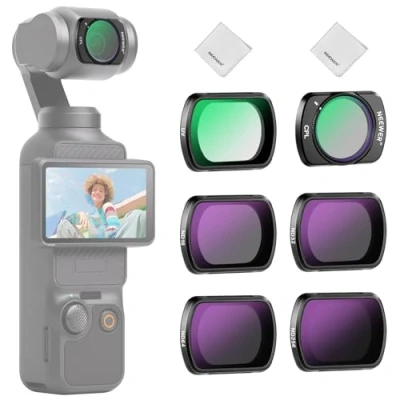 【Designed for Osmo Pocket 3】 Compatible with DJI Osmo Pocket 3 Creator Combo Accessories, this filter set includes four ND filters (ND16, ND32, ND64, ND256) one circular polarizing filter, and one UV filter to improve your gimbal action camera photography and footage. Magnetic attachment is quick and secure, and each filter weighs only 0.06oz/1.62g to retain gimbal balance and performance 【Accurate Exposure Control】 Four ND neutral density filters for your gimbal camera lens reduce light by 4, 5, 6, and 8 stops respectively for precise exposure control across a range of ambient light conditions. They effectively prevent overexposure and allow you to capture movements with expressive motion blur effects in photos 【Minimal Glare, Vibrant Color】 The circular polarizer filter reduces glare and reflections from water, glass, and other nonmetallic surfaces, increase saturation and contrast, and enhance colors and details. The UV filter shields the lens from scratches, dust, and haze 【Multicoated HD Optical Glass】 HD optical glass ensures excellent clarity and sharpness. Multiple protective coatings resist water, smudges, and scratches for safe outdoor use and effortless cleaning. Two cleaning cloths are included as content creator essential and influencer must have gimbal camera photography gear 【Directions for Correct Use】 1. Do not apply protective films to wide angle, macro lenses or ND, CPL filters. 2. When using a wide angle lens on Pocket 3, avoid using ND, CPL, and other filters for optimal results