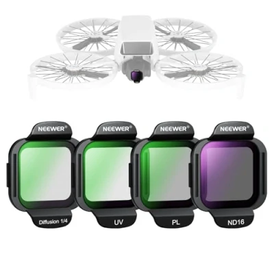 【Compatible with DJI Flip Drone】 This snap on lens filter set compatible with DJI Flip Drone with 4K UHD Camera for Adults includes an ND16, PL, UV, and black diffusion 1/4 filter to elevate your gear's aerial photography and videography. Multicoated HD optical glass ensures excellent photo quality and resists water, fingerprints, and scratches for high durability as content creator essential and influencer must have 【Effortless Exposure Balance】 The ND16 filter reduces the light by 4 stops, suitable for long exposure photography in bright outdoor conditions. It allows you to shoot at slower shutter speeds with larger apertures and capture movements with expressive motion blur effects 【Enhance Saturation/Contrast】 The circular polarizer filter minimizes reflection on nonmetallic surfaces, such as glass and water, and improves saturation and contrast for vibrant colors 【Protective & Clear UV Filter】 The UV filter reduces haze and protects the drone lens from dust, scratches, and ultraviolet light for optimal image quality 【Cinematic Soft Dreamy Effect】 The 1/4 black diffusion filter softens highlights, reduces glare, and creates a dreamy and cinematic effect for drone shooting