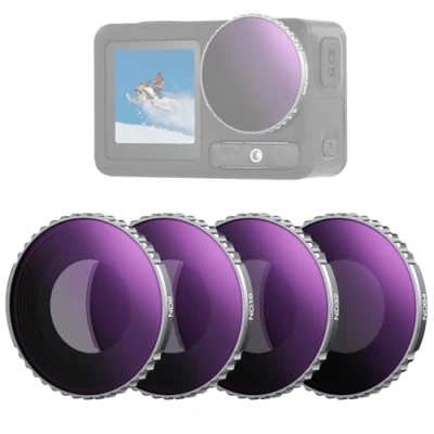 【Only for Osmo Action 5 Pro/4】 ONLY compatible with DJI Osmo Action 5 Pro and Action 4. This filter set features HD optical glass for clear imaging during intensive outdoor activities—perfect for POV shots of surfing, kayaking, skiing, mountain biking, skydiving, skateboarding, and other sports. Note: Not for underwater use, as water will enter and affect the image quality. 【Effortless Exposure Balance】 ND8, ND16, ND32, and ND64 filters reduce light by 3, 4, 5, and 6 stops respectively. They help you precisely balance exposure, prevent overexposure during long exposure photography, and capture dynamic motion blur effects using slower shutter speeds and larger apertures. 【Multicoated HD Optical Glass】 HD optical glass deliver exceptional image quality with 30 layers of protective nanometer coatings on both sides to resist water, oil, dust, and scratches. 【Sleek Aluminum Alloy Frame】 Each filter weighs only 0.15oz/4.3g and features a slim aluminum alloy frame with CNC precision machining for durability and reliability as content creator essentials and influencer must have. 【Easy Thread On Attachment】 Thread on design allows for easy installation and removal while keeping the filter firmly in place during intense outdoor activities. 【Important Note】 Please remove the original lens before filter attachment. If you'd rather not remove the lens, check out our snap on filter series for Osmo Action 5 Pro and Action 4.