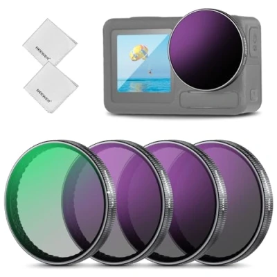 【For Osmo Action 5 Pro/4/3】 Compatible with DJI Osmo Action 5 Pro, Action 4, and Action 3, this 4 Pack filter kit is ideal for POV shots of surfing, kayaking, skiing, mountain biking, skydiving, skateboarding, and hiking. Essential and must have action camera photography gear and accessories for content creators and influencers 【Flexible Exposure Control】 ND8, ND16, and ND32 neutral density action camera lens filters reduce light by 3, 4, and 5 stops respectively. They offer precise exposure balance in different light conditions, prevent overexposure, and create dynamic motion blur effects 【Less Reflection, Richer Colors】 The circular polarizing (polarizer) filter minimizes reflection from glass, water, and other nonmetallic surfaces while boosting saturation and contrast for more vibrant colors 【Multicoated HD Optical Glass】 HD optical glass ensures exceptional image clarity. Multiple coatings on both sides resist water, scratches, and fingerprints. A cleaning cloth is included for daily maintenance 【Quick Snap On Attachment】 Simply attach to the camera's original filter and start shooting. Nonslip interiors keep filters firmly in place