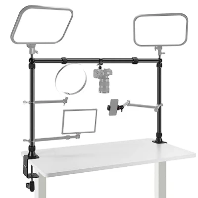 【Heavy Duty Pro C Clamp Light Stand】 Robust anodized aluminum alloy design with 28mm max thickened tubes for exceptional support up to 26.5lb/12kg (15 times heavier than others). Space saving and efficient for limited spaces. The 2.6"/6.5cm wide C clamp with non slip rubber pads ensures secure desktop attachment. Perfect for tabletop live streaming, still life photography, unboxing reviews, online meetings, photography lighting and more overhead shooting scenarios 【DIY Overhead Top Down Platform】 The two 1/4" mounting screws and the 5/8" studs on the stand adapters can attach two additional LED lights for supplementary lighting when needed. Enhance functionality with separately sold mounting accessories and telescopic crossarms, such as NEEWER ST83, ST80, ST20, ST10, ST25C, PS006, UA023, UA014, UA013, ST81, TL253A+DS001, DS001, TL283, TL253A+MH022, ST3, and CR221A (please note that the crossarms are not included) 【Quick & Easy Assembly】Simply clamp the desktop stands, attach the crossbar, and adjust to your preferred height and width, in just three steps. The lock knobs firmly tighten the stands with powerful C clamps, while the convenient twist locks allow for easy height adjustment of 27.2"-48.0"/69cm-122cm and width adjustment of 25.2"-47.2"/64cm-120cm. The precise scale markings on the tubes for more efficient height adjustments 【Flexible Dual Ball Head Super Clamp】 The flexible 360° dual ball heads can be adjusted to any angle for any overhead shooting views, and the super clamp on the other end tightly mount to the crossbar with a hand tighten knob. The 1/4" screw can also attach more accessories like a phone holder (included), monitor, microphone, LED lights and more. Max Load 1.5kg/3.3lb 【Camera & Phone Shooting】 The webcam or a camera can be attached to the 1/4" screw of the magic arm, and the adjustable phone holder can accommodate devices with a width ranging from 2.2" to 3.3" (55 - 85 mm). Compatible with Canon Nikon Sony cameras Logitech C920 C922 Microsoft Razer webcams and iPhone 14 Plus iPhone 14 Pro Max iPhone 13 Pro Max iPhone 13 Mini iPhone 12 11 Pro Max iPhone X Xs XR Samsung Galaxy S20+/S20 Huawei P40 Pro, and other smartphones