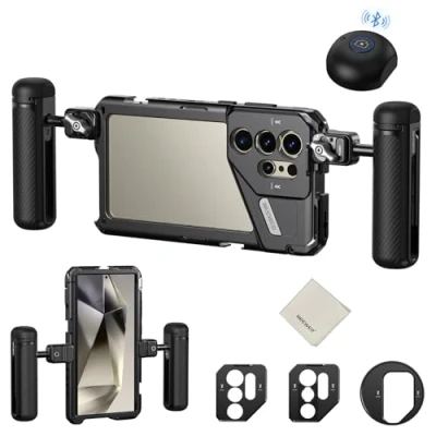 【Compatible with Samsung S24 Ultra】 Designed for Galaxy S24 Ultra, this sturdy aluminum alloy smartphone video rig kit features a 67mm filter thread, a 17mm thread lens backplate, and a T mount lens backplate for video recording, vlogging, YouTube/TikTok live streaming, mobile photography, filmmaking, and videography. A cleaning cloth helps you keep it clean for everyday use 【1 Click Installation with Full Access】 This integrated phone cage quickly opens and locks via a side button and fits seamlessly with the S24 Ultra without blocking the phone camera, charging port, and function buttons. Lined with shock absorbing rubber cushions, it is a protective and versatile phone stabilizer for video recording indoors and outdoors 【Two Quick Release Side Handles】 Two quick release side handles instantly clamp on the phone cage holder and get secured with locking knobs, and one has a removable Bluetooth shutter for wireless photo capture and video recording. Both feature 360° rotation, nonslip rubber grips, and cold shoes for mounting LED lights (PL81/RGB62) and microphones (CM14 Pro), compatible with Rode wireless go 2 II and more photography accessories 【67mm Threaded Filter Adapter】 The snap on 67mm filter adapter connects ND, CPL, UV, black diffusion, graduated color, star, blue streak, light pollution reduction, and other effect filters for creative photos and videos without unwanted vignetting (filters sold separately). Ideal for social media content creators, influencers, video makers, movie makers, youtubers, vloggers, etc. 【17mm Threaded Lens Backplate】 The 17mm threaded lens backplate mounts 105mm macro, 10x macro, 8mm fisheye, 45x microscope with LED light, 7x telephoto, 60mm telephoto, 18mm wide angle, 1.55x blue anamorphic, and other NEEWER phone attachment lenses with 17mm threads (lenses sold separately). Note: 1. Please disable focus enhancer. 2. If vignetting occurs, zoom the camera out to 1.1x or more
