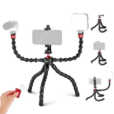 【Flexible Octopus Vlog Tripod】 The T91 Flexible Phone Tripod with soft and bendable legs lets you freely adjust the height and angles or warp this lightweight tripod around tree branches, lamp posts, or railings. For smart phones with the included phone holder, also for cameras, and more photography accessories with 360° rotation and 90° tilts. T91 tabletop tripod stand for cell phone also doubles as a portable handgrip or selfie stick for outdoor travel photography and videography 【Two Detachable Extension Arms】 Two bendable extension magic arms firmly attach to the small shooting tripod via 1/4" screws with locating pins, and have cold shoes on top for mounting accessories such as LED fill lights and mini microphones that help improve the quality of videos, live streaming, selfies, and vlogging 【Adjustable Smartphone Clamp】 The adjustable phone clamp accessory can secure any smartphone 2.1"-3.7" (5.5-9.5cm) wide and support it in vertical and horizontal orientations with the 360° pivot design. Enable this portable desk mini camera tripod stand compatible with iPhone 16 15 Pro Max 14 Plus Pro Max 13 Pro Max Mini 12 11, compatible with Samsung Galaxy S24 S23 S22 Ultra, compatible with Google Pixel 9 8 Pro 7 Pro 6a Huawei Oppo Reno and other Android mobile phones 【Desktop Camera Tripod Stand】 The action camera mount adapter accessory is compatible with GoPro Hero 13 12 go pro 11 10 9 8 Max compatible with Insta360 x4 X3 Insta 360 X2 ONE RS GO 2 GO 3 compatible with DJI Osmo Action 5 Pro 4 3 2 compatible with AKASO compatible with APEMAN compatible with Campark compatible with SJCAM and more. The ball head with a 1/4" screw can support a webcam, DSLR mirrorless vlog camera up to 4.4lb (2kg), compatible with Sony a7iii zv-e10 alpha 7c, etc. 【Handy Remote Shutter Release】 Pair the remote shutter release with your iOS or Android mobile devices via the Bluetooth connection, then you can take selfies, capture photos, and record videos with a tap on the button from up to 33ft (10m) away. This table tripod for phone and camera can be essential and complete units for content creators and influencers with ultimate convenience