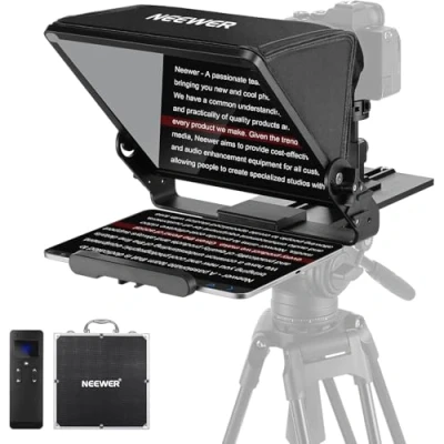 【Assembly Free Teleprompter】 Designed to elevate your video production, live streaming, and vlogging, X12 II is an all in one teleprompter that requires no assembly. By eliminating the need to memorize the script, it helps you read every word naturally and act confidently in front of the camera. A hard aluminum case is included to store and transport this DSLR camera teleprompter 【12" Ultra Clear Beamsplitter】 The 12" multicoated beamsplitter with 71% light transmittance ensures clear reflections and a 10ft/3m reading range. For bigger displays, consider NEEWER X14, X14 Pro, X14 III, X16, and X17 II teleprompters 【Arca Type QR Camera Mount】 With 4 sided Arca type dovetails, the square quick release plate allows rapid camera mounting and removal without alignment. Besides Arca type clamps, it is also compatible with PD clips for seamless camera transfers. The 1/4" screw suits cameras and camcorders of up to 22lb/10kg. 14.6cm horizontal and 2.6cm vertical adjustments accommodate cameras of different sizes for optimal positioning 【Intelligent Remote Control】 Control via the included RT113 remote (AAA batteries not included) and the NEEWER Teleprompter App. Pair the remote with your tablet in the app via Bluetooth connection or a direct Bluetooth link. Simply click the quiet buttons to play/pause, adjust scroll speed, turn script pages, and change font size. The app is compatible with iOS 11.0 Android 6.0 and later 【Multiple Accessory Mounts】 The rigid aluminum alloy structure ensures stability. The base features multiple 1/4" and 3/8" threads for secure mounting on tripods, light stands, and other supports. Additionally, three cold shoes attach accessories like LED lights, microphones