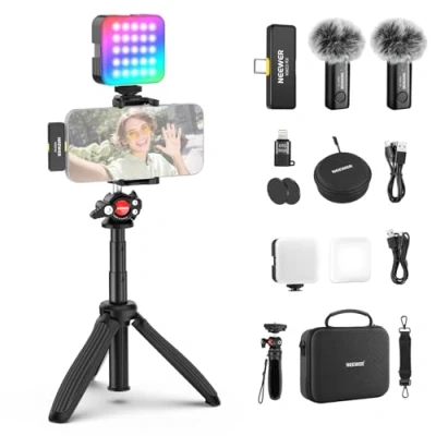 【Complete Content Creator Kit】 This vlogging kit is tailored for travel vlogs, podcasts, YouTube/TikTok social media live streaming, video recording, and filming. A YouTuber starter equipment kit compatible with iPhone, it is a necessity for anyone who wants to elevate content creation 【Compact RGB LED Video Light】 RGB61 mini portable LED panel Video cube Light offers 360° full colors, 0–100% dimming, 2500K–8500K color temperature, 20 scene effects, 800lux/0.5m illuminance, and CRI 97 for high color accuracy, as selfie lighting compatible with iPhone. A 2000mAh built in rechargeable battery ensures hours of continuous illumination, perfect for vlogging indoor and out, key light or soft fill light for video recording 【Wireless Lavalier Microphone】 KM23 Wireless Lavalier noise canceling Mic System includes 1x RX and 2x TX accessories, compatible with iPhone 16 15 Pro Max Plus 14 for vlogging and video recording, compatible with iPad, Android cell phones, and USB C tablets. It features 1 click noise cancellation, 360° omnidirectional pickup, 131ft/40m stable 2.4G transmission, and battery life up to 8 hours for extended recording sessions. Lightweight TX units are discreet and won't sag clothes 【2 In 1 Travel Tripod/Selfie Stick】 TP38 Versatile Tripod comes with a 2.4"–3.4"/60–86mm universal phone holder and an 8"-15"/21-38cm extendable column that doubles as a selfie stick. It includes two cold shoe mounts and a flexible soft tube to attach the LED light and microphone for enhanced content quality 【Sturdy & Portable Storage Case】 The rugged hard case with a custom EVA padding provides secure storage and protection for all your gear. It features a comfortable handle and a shoulder strap for easy transport