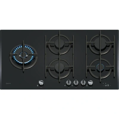 Take control of dinner time with this Neff N90 gas hob. With FlameSelect, you get nine precise power levels, so it's easy to get the heat just right. The cast iron supports keep your pots and pans firmly in place. You can even pop them in dishwasher afterwards if your sauce splatters during cooking. And the metallic sword knobs lights up so they're easy to adjust and can be removed so you can wipe the hob down. Good to know - Sizzle, simmer, steam and sauté at the same time with its five gas burners- Whip up large stir fries quickly thanks to its powerful dual wok burner - The gas safety cut-off automatically turns off the gas supply if the flame goes out- The display with residual heat indicator lets you know if the hob's still hot, even after turning it off- Automatic ignition lets you light each burner with one hand - just push and twist the knob- Set a timer or control your compatible hood with its touch control display- The tempered glass is built tough and brings a cool, contemporary look to your kitchenGAS INSTALLATION: This product requires installation by a qualified gas safe engineer, such as one of our Tech Experts (available in the UK only).ELECTRICAL INSTALLATION: This product requires professional installation to a 13 Amp fused spur by a qualified installer, such as one of our Tech Experts.