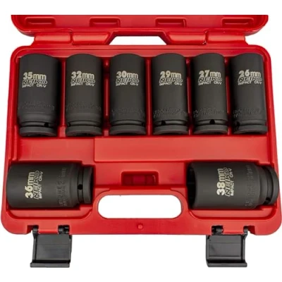 HEAVY DUTY BUILD: The construction of each 3/4” socket in this 8 piece set consists of extremely strong Chrome Vanadium (Cr-V) steel that will output greater torque, but also has a corrosion resistant black phosphate finish to give your sets longevity and longer lifespan. LARGE SOCKET: This ¾” impact socket set is designed for use with impact wrenches. A set of 8 high-torque, 6-point Metric sockets with ¾ inch drive, each jumbo socket is used to remove tough nuts and bolts on larger vehicles. SPECIAL DEEP DESIGN: Each socket has a unique design that grips the flat sides of fasteners rather than the corners to prevent stripping and rounding off of bolts. With a high torque impact gun, each Metric socket will torque the most stubborn fasteners. HIGH VISIBILITY MARKINGS: The easy-to-see high-contrast laser-etched Metric size markings allow easy reading in low light settings and promote efficiency on the job. INCLUDES COMMON METRIC SIZES: Includes eight common Metric socket sizes (26, 27, 29, 30, 32, 35, 36, 38 mm) with blow-mold storage case included., Weight: 12.5 pounds, Manufacturer: Ridgerock Tools Inc.