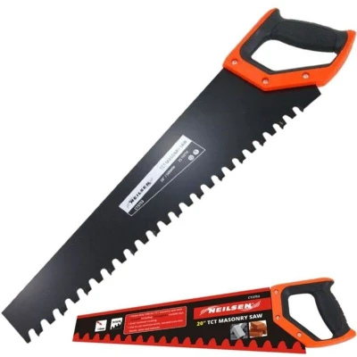 ManoManoGeneral description The Neilsen Tct Masonry Hardpoint Brick Concrete Universal Cut Hand Saw is a heavy-duty 20" (500mm) saw designed for cutting through tough materials such as brick, aerated concrete blocks, slate, and cement products. It features 13 tungsten carbide tips for enhanced durability and performance. Technical specifications Length: 20" (500mm) Material: Tungsten Carbide Tips (13 tips) Coating: Bonded rust-resistant coating