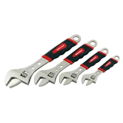 AmazonSET CONTENT: 4pc adjustable spanner set SIZES: 6 8 10 12in and 150 200 250 300mm CONSTRUCTION: Heat treated and drop forged FINISH: Pearl nickel surface with graduations and jaw measurements HANDLE DESIGN: Soft grip TPR handles with hexagonal holes for extra torque, Manufacturer: Neilsen