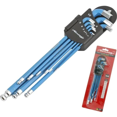 Neilen 9pc Extra Short & Long Metric Ball Point Hex Allen Key Set 1.5mm - 10mm Extra-short arm for use on difficult-to-access screws. Long side with ball head allows dependable working even in difficult situations. S2, surface coating chrome plated or color coded. Size: 1.5mm x 90mm length x 5.5mm short end 2.0mm x 100mm length x 6.0mm short end 2.5mm x 112mm length x 7.5mm short end 3.0mm x 126mm length x 10mm short end 4.0mm x 145mm length x 10mm short end 5.0mm x 160mm length x 12mm short end 6.0mm x 180mm length x 15mm short end 8.0mm x 200mm length x 19mm short end 10mm x 219mm length x 20mm short end