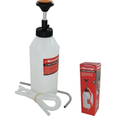 Neilsen Multi Purpose Pump 1l Multipurpose pump perfect for topping up difficult to access points on motor vehicles, lawnmowers, chainsaws and other jobs around the workshop and home. Capacity 1000 ml Suitable for all engine oils, transmission fluids, brake fluids and general-purpose cleaners. Not suitable for gasoline and other easy flammable liquids Hose length: 95cm Net weight: 280g