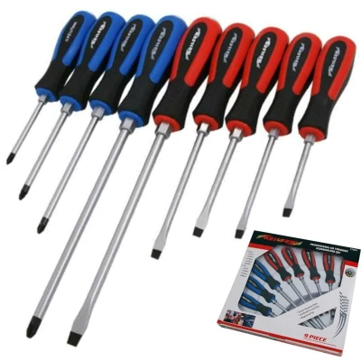 General description Neilsen 9pc Professional Pozi Flat Slotted Magnetic Tip Screwdriver Set is designed for durability and ease of use. The set features hardened and tempered Chrome Vanadium steel shafts with a satin polished finish, ensuring long-lasting performance. Technical specifications Material: Chrome Vanadium steel Finish: Satin polished Slotted sizes: 5x75mm, 5x100mm, 6x100mm, 6x125mm, 8x200mm Pozi sizes: 1x75mm, 2x100mm, 2x125mm, 3x200mm Compatibility and accessories Hexagonal bolsters for use with a wrench Usage Contoured, textured handles with hammer caps for improved grip and control Magnetized tips for easy screw handling