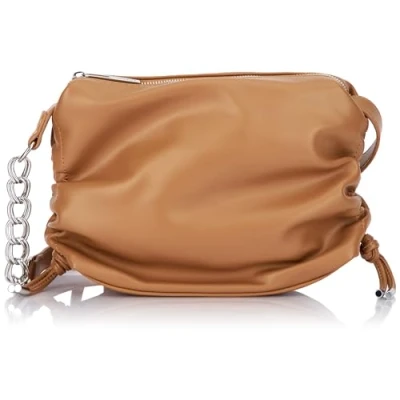 faux leather handbag Side drawstrings Long shoulder strap with chain detail Inner side made of textile