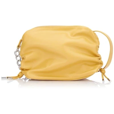 faux leather handbag Side drawstrings Long shoulder strap with chain detail Inner side made of textile