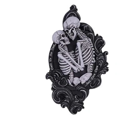 Skeleton Wall Plaque: Exclusively available from Nemesis Now is this And Even Then Wall Plaque Gothic Home Décor: Featuring a pair of skeleton lovers who deeply admire one another, with the words 'Until We Are Dust…And Even Then' around the outside of the plaque Cast in the finest resin: Cast in the finest resin before being expertly hand-painted Gothic Gift: This wall plaque would make the ideal gift for any gothic lover Wall Hanging Sculptures: Wall mounted collectibles are brilliant for those who do not have a lot of shelf space