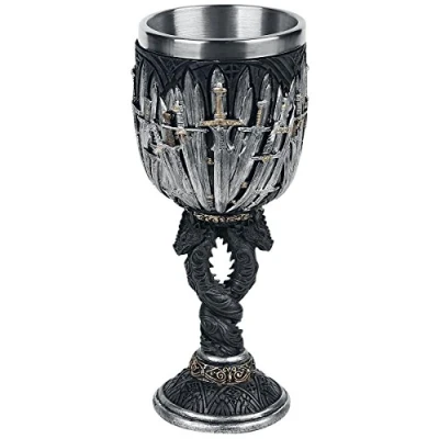 Impressive medieval sword design Cast in the finest resin before being painstakingly hand-painted This goblet comes with a removable stainless steel insert for ease of cleaning Size 17.5cm Weight 0.41667kg