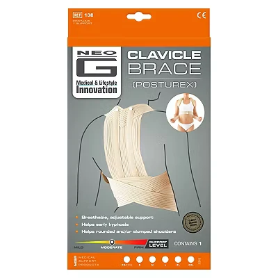 Boots108 Advantage card points. The Neo G Clavicle Brace (Posturex) has been designed to help support an early kyphosis by encouraging correct alignment of the dorsal and lumbar spine. See details below. Always read the label. FREE Delivery on orders over 45 GBP.