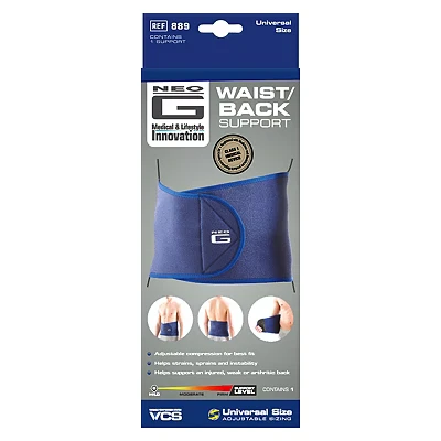 81 Advantage card points. The Neo G Waist/Back Support helps stabilise unwanted movements and reduce strain on forward and backward bending and twisting movements, making it ideal in helping with repetitive sports or occupational stresses. FREE Delivery on orders over 45 GBP.