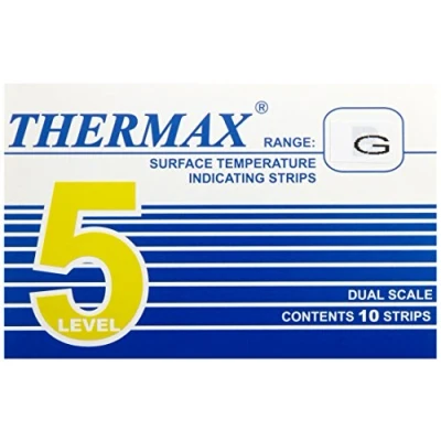 Temperature indicating strips, each with 5 temperature change points on self-adhesive film. The respective temperature rating is reached within 1 sec. With an irreversible colour change from light grey to black. Max. temp: 210°C. Min. temp: 188°C.