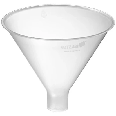 With short, wide spout. For the transfer of powder substances. Material: polypropylene. DM: 150 mm. Spout diameter: inner 29 mm.