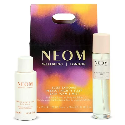 LUXURY GIFTING - This festive season give the gift of NEOM Wellbeing, with our Sleep Saviours Gift Set our ready-made sleep set, perfectly packaged to help you unwind and relax after a busy day and feel prepared for bed. 100% NATURAL FRAGRANCES - Expertly blended with 100% natural essential oils including lavender, chamomile and patchouli. SCENT TO SLEEP – Nothing affects how you look or feel as much as sleep, or lack of it. The NEOM Scent To Sleep range has been specially formulated to relax your mind and body to enjoy the perfect night’s sleep WHAT'S INCLUDED - The Sleep Saviours Gift Set contains our Perfect Night’s Sleep Bath Foam (50ml) and Perfect Night’s Sleep Mist (30ml). HOW TO USE - Let us help you to create the ultimate nightly routine... Enjoy a skin-loving soak with our Perfect Night’s Sleep Bath Foam. Then finally, just before lights out, spritz our Perfect Night’s Sleep Mist to really help you drift off.