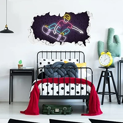 Neon Skateboard Broken Wall Sticker Decal Home Art Bedroom Skating Mural (90cm Width x 45cm Height)