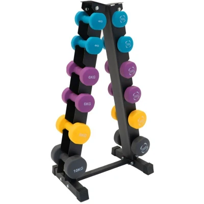 General description Step up your home workouts and strength training with the 4-10kg Neoprene Dumbbell Set featuring a robust 6-tier heavy-duty steel A-frame rack. This set is designed for durability, convenience, and safety, making it an essential addition for anyone eager to build strength and sculpt muscles. Technical specifications Dumbbells: Material: Cast Iron Colour: Blue, Purple, Yellow, Black Coating: Neoprene Weight: 76kg Dimensions (10kg Dumbbell): Width: 13cm / 0.13m / 5.1”, Height: 13cm / 0.13m / 5.1”, Depth: 25cm / 0.25m / 9.8” Rack: Material: Alloy Steel Colour: Black Weight: 9kg Dimensions: Width: 55cm / 0.55m / 21.6”, Height: 105cm / 1.05m / 41.3”, Depth: 37cm / 0.37m / 14.5” Load Capacity: 240kg Usage The set includes 2x4kg, 2x6kg, 1x8kg, and 1x10kg dumbbell pairs, perfect for a wide range of exercises. Ergonomically designed easy-grip handles provide a comfortable and secure hold during workouts. The anti-roll hexagonal shape prevents dumbbells from rolling away