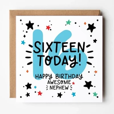Sixteen Today! - Celebrate your nephew's milestone moment with this bright and cheerful sixteenth 16th birthday card for your awesome nephew! A unique 16th birthday card with Lunella Stationery's signature hand-drawn design - Features a blue “16” design with playful stars all around – perfect for a 16-year-old. It's timeless and classic. Printed on premium 350gsm FSC certified white card and comes paired with a Kraft envelope. Blank inside for your own message. Designed & Printed in the UK - Created by Lunella Stationery, a proudly independent British brand.