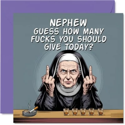 MAKE YOUR NEPHEW SMILE WITH THIS UNIQUE BIRTHDAY CARD: This exceptional quality Nephew birthday card shows the design 'Nephew Guess how many fucks you should give today? Nun'. If you are looking for an awesome birthday card for Nephew, then then this happy birthday Nephew card is bound to make them smile. Not just a birthday card for Nephew this could also be a birthday gifts for Nephew, Step Nephew or Nephew in Law. WHAT DO YOU GET: The card is printed on one side and BLANK ON THE INSIDE to allow you to write your very own message. The unique fun design is printed on a specially sourced and environmentally responsible board. At 360 microns thick the natural white one-sided gloss board has a quality look and feel. Supplied with a coloured gummed envelope to complement the design and ready to be sealed and sent in the post. Great Nephew birthday cards, Step Nephew birthday card. NO INK SMUDGES: There is nothing worse than writing inside a card to find that the shiny surface makes the ink smudge. This is why we use a high quality one sided coated board. The uncoated side will absorb more of the ink from your pen to make smudging a thing of the past. Nephew birthday cards, Nephew birthday cards from Auntie. SIZES: Greeting Card = 145mm x 145mm, Envelope = 155mm x 155mm, Card Thickness = 360 micron. Happy birthday Nephew, Nephews birthday card, Nephew cards birthday, birthday card Nephew, happy birthday Nephew card, Nephew gifts from Auntie. MADE AND QUALITY CHECKED IN THE UK: We print and manufacture all our products right here in the UK so you can be sure of a fast turnaround and a product that is expertly made. Using environmentally responsible premium board our card is conscious of the responsible management of the world's forests - happy birthday card Nephew, Nephew birthday cards.