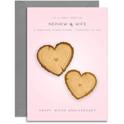 NEPHEW & WIFE 5 YEAR ANNIVERSARY CARD ⭐ Wood Hearts Design ⭐ Click the second image for the text inside the card. EXTRA THICK CARDSTOCK ⭐ 330gsm triple coated cardstock with a lovely matt inside surface for ease of writing SIZE ⭐This anniversary card measure 148 x 210mm (A5 Size) and comes with a 162 x 229mm Grey envelope UK MANUFACTURED ⭐ A small family business. Professionally printed in our Hampshire factory ECO FRIENDLY ⭐ Our factory runs on 100% renewable energy. Our cardstock is sustainably sourced. Both the card and envelope are fully recyclable.