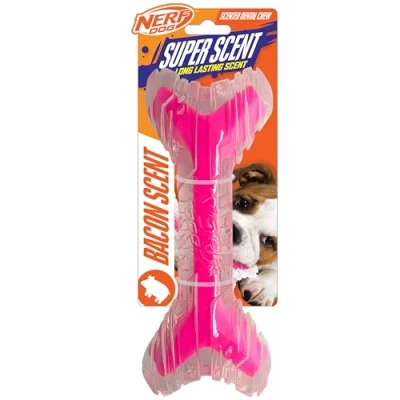 Nerf Dog 9in TPR/PP Scented Bacon Scentology Bone Solid Core Clear/Pink