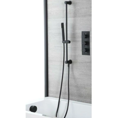 General description The modern Milano Nero two outlet bath and shower system is the ideal choice to add style to your bathroom. Accentuated by a matte black powder coated finish, the solid brass system includes a triple thermostatic valve, overflow bath filler, and riser rail kit. Thanks to the thermostatic control, the valve allows accurate adjustment of the temperature and flow of water, while the integral anti-scald technology prevents sudden changes in temperature. This multi-function valve can operate both outlets simultaneously, giving you total control to enjoy your shower and bath just the way you like it. Technical specifications Material: Solid brass Finish: Matte black powder coated Minimum recommended pressure: 1.0 bar Riser rail kit includes: Brass hand shower, 1.75m smooth hose, outlet elbow, and slide rail Overflow bath filler with click-clack waste for baths up to 15mm thick Ergonomic round handles for intuitive use Silicone nozzles for easy cleaning and removal of