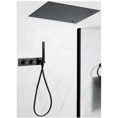 Nero Modern 2 Outlet Twin Diverter Thermostatic Mixer Valve with 400mm Square Recessed Ceiling Mounted Rainfall Shower Head and Hand Handset