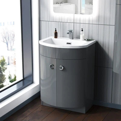General description Stylish and functional, the Dene 600mm Vanity Basin Unit in Grey is designed to enhance contemporary bathrooms. This storage unit features a built-in poly marble basin and a luxurious light grey gloss finish, complemented by sleek curved edges. Engineered for everyday use, it offers both durability and a practical storage solution. Technical specifications Style: Contemporary Height: 825mm Width: 600mm Unit Type: Basin Vanity Unit Handles: Chrome Door Hinges: Soft close Basin Included: Yes Basin Finish: White Basin Material: Poly marble Tap Hole: Single Overflow: Yes Mounting Type: Freestanding Vanity Weight: 25kg Basin Weight: 9.5kg Guarantee: 10 years Compatibility and accessories Tap and waste are sold separately Installation Supplied assembled