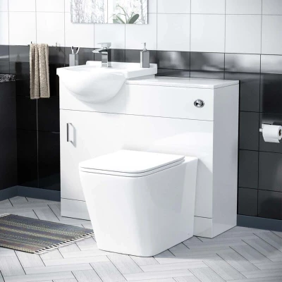The rimless back to wall toilet pan and seat is an ultra-modern designer shape. Mixing with subtle curves and clear cut direct lines. The rimless delivers an ultimate level of hygiene for your bathroom, there is no secret rim where bacteria, germs or lime scale can build up. This basin vanity unit and back to wall WC toilet come complete with a 10-year Guarantee. Key Features 1 door Cabinet Material: Water resistant 16mm Grade A MDF Finish: High White Gloss Basin Material: Ceramic With One Tap Hole & Waste Handle Material: Polished Chrome Stainless Steel Supplied fully assembled Supplied with fixings 10 Year Guarantee Please note: basin tap and waste are not included Package Contents: Basin and vanity unit Vanity Specifications Style: Contemporary Height: 781 mm Width: 450 mm Depth: 440 mm Unit Type: Basin Vanity Unit Material: MDF Handles: Exposed Door Hinges: Soft close Basin Included: Yes Basin Finish: White Basin Material: Ceramic Tap Hole: Single Overflow: Yes Mounting Type: