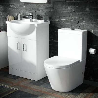 General description This Dyon 550mm Floor Standing Basin Flat Pack Vanity Unit in White, paired with a Rimless Close Coupled Toilet in White, offers a modern and stylish solution for your bathroom. The high gloss glaze finish enhances its aesthetic appeal while ensuring durability. Technical specifications Toilet Height: 800mm Toilet Width: 365mm Toilet Projection: 610mm Toilet Type: Rimless Close Coupled Finish: High gloss glaze white finish Material: Ceramic Seat Type: Soft Close Cistern: 3/6 Litre Dual Flush Basin Height: 781mm Basin Width: 550mm Basin Depth: 300mm Basin Material: Ceramic Vanity Unit Material: MDF with White finish Compatibility and accessories Waste and taps are sold separately. Other information This package comes with a 10 year guarantee.