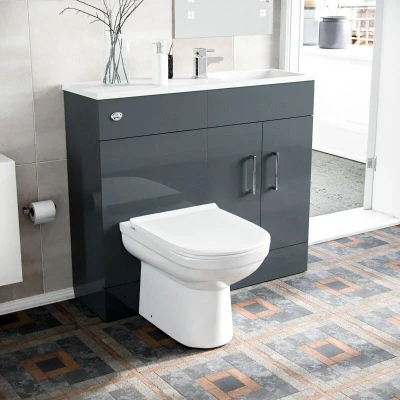 General description This James 1000mm Freestanding Grey MDF Slimline Vanity, Basin, WC Unit & Back-To-Wall Toilet is designed to enhance the style of any cloakroom, en-suite, or smaller bathroom where space is limited. Its stylish modern design conceals unsightly pipework, creating a neat and contemporary look. The unit is constructed from 100% moisture-resistant MDF, ensuring durability and longevity. Technical specifications Vanity Unit Width: 535mm Vanity Unit Height: 845mm Vanity Unit Depth: 300mm Integrated Top with Basin Width: 1000mm Integrated Top with Basin Depth: 305mm Integrated Top with Basin Height: 20mm WC Unit Width: 455mm WC Unit Height: 845mm WC Unit Depth: 300mm Toilet Width: 360mm Toilet Height: 417mm Toilet Depth: 540mm Weight: 27kg Compatibility and accessories Tap and waste are sold separately Installation Floor mounted vanity unit and basin for elegant design and extra storage space Usage Two soft close doors to discreetly store bathroom essentials Premium soft
