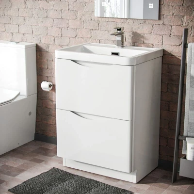 General description The Merton 600mm Freestanding Bathroom Vanity Basin Unit in White is a stylish and functional addition to any contemporary bathroom. Constructed from 100% moisture-resistant MDF, this unit features a luxurious white gloss finish and sleek curved edges, making it both durable and aesthetically pleasing. It includes a built-in basin and offers ample storage with soft-closing drawers, designed for everyday use. Technical specifications Style: Contemporary Height: 850mm Width: 600mm Unit Type: Basin Vanity Unit Material: MDF Handles: Concealed Drawers Type: Soft Close Basin Included: Yes Basin Finish: White Top Hole: Single Overflow: Yes Mounting Type: Freestanding Vanity Weight: 26.5kg Basin Weight: 12.5kg Guarantee: 10 years Other information Package Contents: 1 x Basin and Vanity Unit (excludes basin tap and waste)