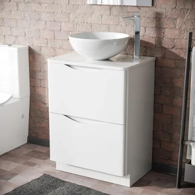 General description The Merton White 600mm Bathroom Freestanding Vanity Unit combines style and functionality, featuring a sleek design with a round ceramic countertop and a spacious basin. This unit is perfect for modern bathrooms, offering ample storage with its two soft-close drawers. Technical specifications Height: 800mm Width: 600mm Depth: 450mm Material: 100% moisture-proof MDF Unit Type: 2 drawer unit Drawer Hinges: Soft close Colour: White Mounting Type: Freestanding Basin Height: 160mm Basin Width: 420mm Basin Material: Ceramic Basin Finish: Glossy Compatibility and accessories Tap & Waste are sold separately Installation Supplied assembled with matching worktop Usage Ideal for modern bathrooms, providing storage and a stylish basin for daily use