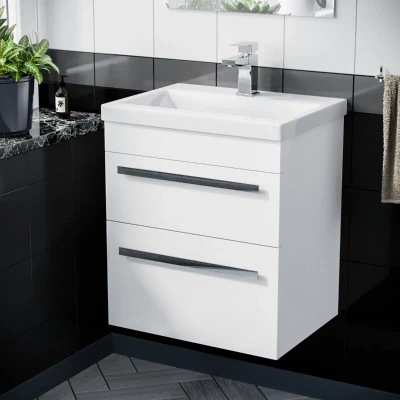 General description The Nanuya 500mm Wall Hung 2 Drawer Vanity Basin Unit in White is designed for modern bathrooms, featuring a luxurious gloss white finish and a stylish storage solution. The unit is fully assembled for easy installation and includes soft close runners for a smooth operation. Technical specifications Width: 495mm Depth: 395mm Height: 550mm Ceramic Sink Basin Overflow: Yes Tap Hole: Single Drawer: Two Compatibility and accessories Excludes basin tap and waste