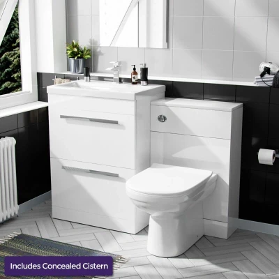 General description The Nanuya 600mm Floorstanding 2 Drawer Vanity Basin Unit is a stylish and practical addition to modern bathrooms. This unit features a high-quality finish and is designed for easy installation, as it comes fully assembled. The suite includes a rimless pan with a dual flush cistern, promoting water conservation and cost savings. Technical specifications Vanity Cabinet Width: 595mm Vanity Cabinet Depth: 390mm Vanity Cabinet Height: 790mm Drawer Type: Soft Close Basin Width: 610mm Basin Depth: 395mm WC Unit Width: 500mm WC Unit Height: 800mm WC Unit Projection: 200mm Toilet Width: 350mm Toilet Depth: 540mm Toilet Height: 395mm Cistern overflow: Internal Compatibility and accessories Waste connections: Through the wall or floor Package Contents: Vanity Unit, Basin, WC Unit, Toilet Pan, Toilet Seat, Cistern Installation The unit is delivered fully assembled, making the installation process straightforward and efficient. Usage This vanity unit is designed for everyday