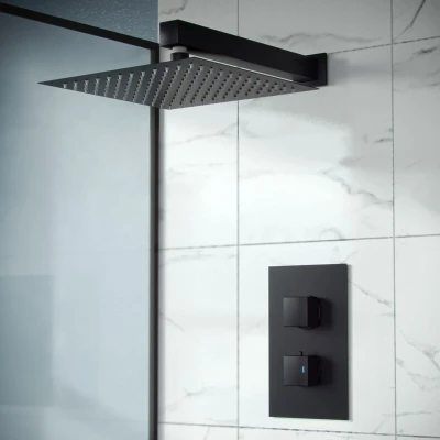 General description This Rennes Concealed Thermostatic Overhead 200mm Square Rainfall Shower Mixer Set in Matte Black combines high-quality design with advanced functionality. It features a thermostatic valve that ensures a consistent water temperature, providing a luxurious shower experience. Technical specifications Thermostatic valve operating range: 20 - 50 deg C Temperature control accuracy: +/-1ºC Pre-set maximum temperature with safety button at 38 deg C Minimum water pressure requirement: 1.0 bar Shower arm length: 300mm Shower head connection: ½ inch Shower head size: 200mm Compatibility and accessories Suitable for various water systems: Combi-boilers, Gravity Fed systems, MegaFlow Systems, Pumped systems, Un-vented systems, Pressurised cylinder systems Package includes: 1 x Shower head, 1 x Shower arm, 1 x Installation Guide, 1 x Concealed Thermostatic Mixer Valve Installation Wall mounted installation Easy to install with standard UK fittings Usage Single mode shower head