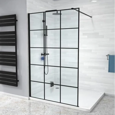 General description Stanley 1200mm Black Grid Framed Walk-In Shower Enclosure combines style and functionality. It features a modern black grid pattern that is printed on the outside of the 8mm toughened safety glass, making it not only durable but also easy to clean. The enclosure includes a support arm that stabilizes the glass screen, ensuring safety and stability. Its reversible design allows for flexible installation, accommodating both left and right-hand entry. Technical specifications Height of glass panel: 1900mm Width: 1180mm - 1200mm Panel Material: 8mm tempered safety glass Frame Material: Aluminium Profile Colour: Black Pattern: Black Grid Package Contents Wet Room Panel Support Bar