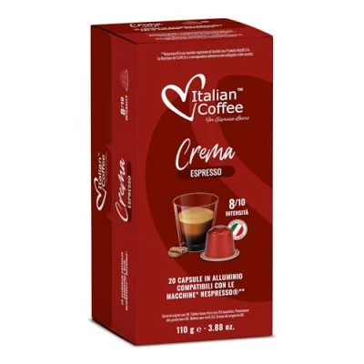 Rich and creamy espresso experience: Crema Espresso is created for those who love a full-bodied coffee with a smooth, rounded taste. It delivers a satisfying intensity and a velvety texture, designed to bring an espresso-bar style cup into everyday home routines. Arabica and Robusta blend, balanced and structured: With 40% Arabica and 60% Robusta, this blend combines aroma and strength in a well-balanced profile. The result is bold but never harsh, with a persistent finish that remains pleasant from the first sip to the end of the cup. Intensity 8, classic Italian character: With an intensity of 8, Crema Espresso offers a decisive taste that is ideal for mornings, after meals, or when you want a stronger coffee break. Recommended cup size is 35 ml for the best espresso-style result. 100 aluminium capsules, 5 packs of 20 for freshness: The multipack contains 100 aluminium capsules, divided into 5 packs of 20. This format makes storage practical and helps preserve aroma over time, while giving you a convenient supply for daily use. Compatible with Nespresso machines, aluminium capsule format: Designed for use with Nespresso systems, these aluminium capsules are created for consistent extraction and reliable results in every cup. A convenient way to enjoy Italian roasted coffee at home, with a format designed for performance and protection.