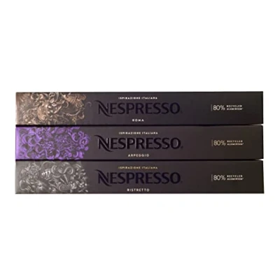 Nespresso Trio Pack 30 Capsules Pods Ristretto Arpeggio Roma Brand : Nespresso Product type: COFFEE 10 Count Pack of 3 Ristretto Arpeggio Roma Espresso Coffee Capsules