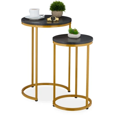 Nesting Tables, 2 Piece Set, Sizes, Marble Effect, Metal Legs, Round, Living Room, for Sofa, Black/Gold Relaxdays